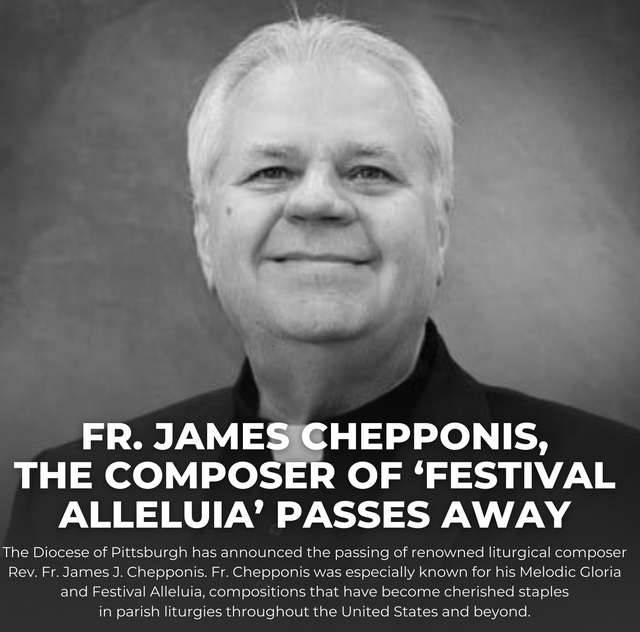 Fr. Jim ("Chip") Chepponis and his family were members of Lawrenceville's St. Augustine Parish, and Jim graduated from St. Fidelis College where he received his bachelor's degree in music from St. Fidelis College/Slippery Rock University. Mick Joyce, OFM Cap., was a classmate. Jim majored in organ with a minor in voice, but his musical talent was known throughout his younger years. Discerning in Annapolis' St. Conrad Novitiate that the Capuchin life was not his calling, he went on to Theology studies with the Diocese of Pittsburgh. As a priest of the Diocese, his first published composition was his Magnificat, first sung while he was in high school at St. Fidelis when he was asked to write something for an Evening Prayer's New Testament Canticle. He wrote it in a few hours, and it became his first officially published work in 1985 ("Proclaim the greatness of God, rejoice in God my Savior . . ."). Another of his best-known compositions, Festival Alleluia, was commissioned for a 1999 Mass of Pope John Paul II in St. Louis. All three subsequent popes have also had his music at their Masses.
